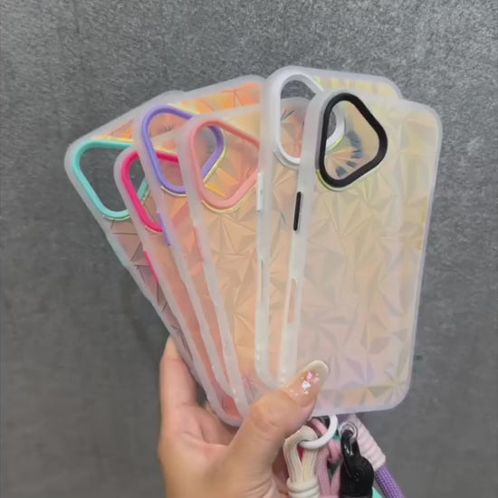 Aurora Ice case, engineered for iPhone 16, 15, 14 Pro Max, and compatible models. The laser gradient design delivers eye-catching visual appeal while the integrated wrist strap ensures secure handling and convenient portability. Crafted from premium soft materials, this case absorbs impact effectively while maintaining a slim profile. The colorful finish resists fading and scratches, keeping your device looking pristine.
