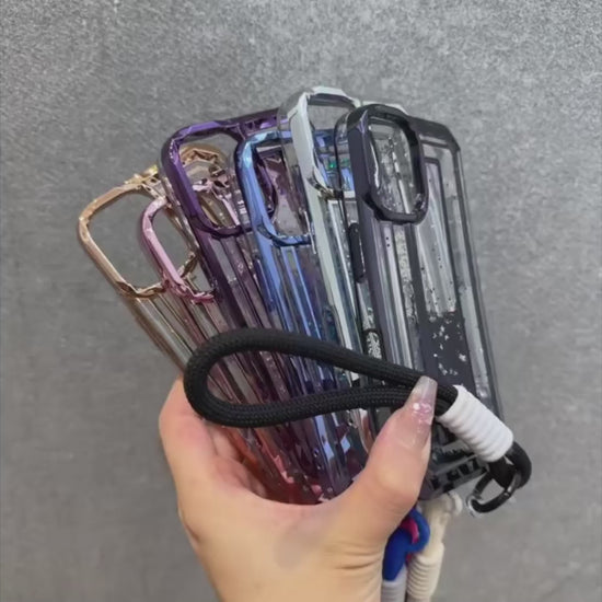 This colorful clear phone case combines vibrant glitter and dynamic star-shaped quicksand that shifts with every movement, providing a uniquely interactive look. It features colorful plating for added style and includes a sturdy wrist strap for easy carrying and enhanced protection. This case not only safeguards your device but also adds a playful, eye-catching flair to your everyday use.